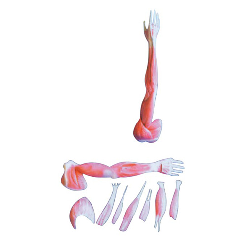 ■ 上肢肌肉附主要血管神经模型,由上肢肌、三角肌、肱三头肌、肱桡肌、旋前圆肌、指浅屈肌、臀丛和腋动脉等部件组成。